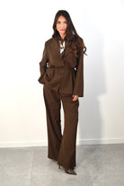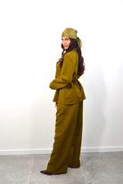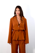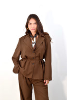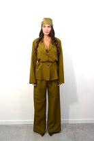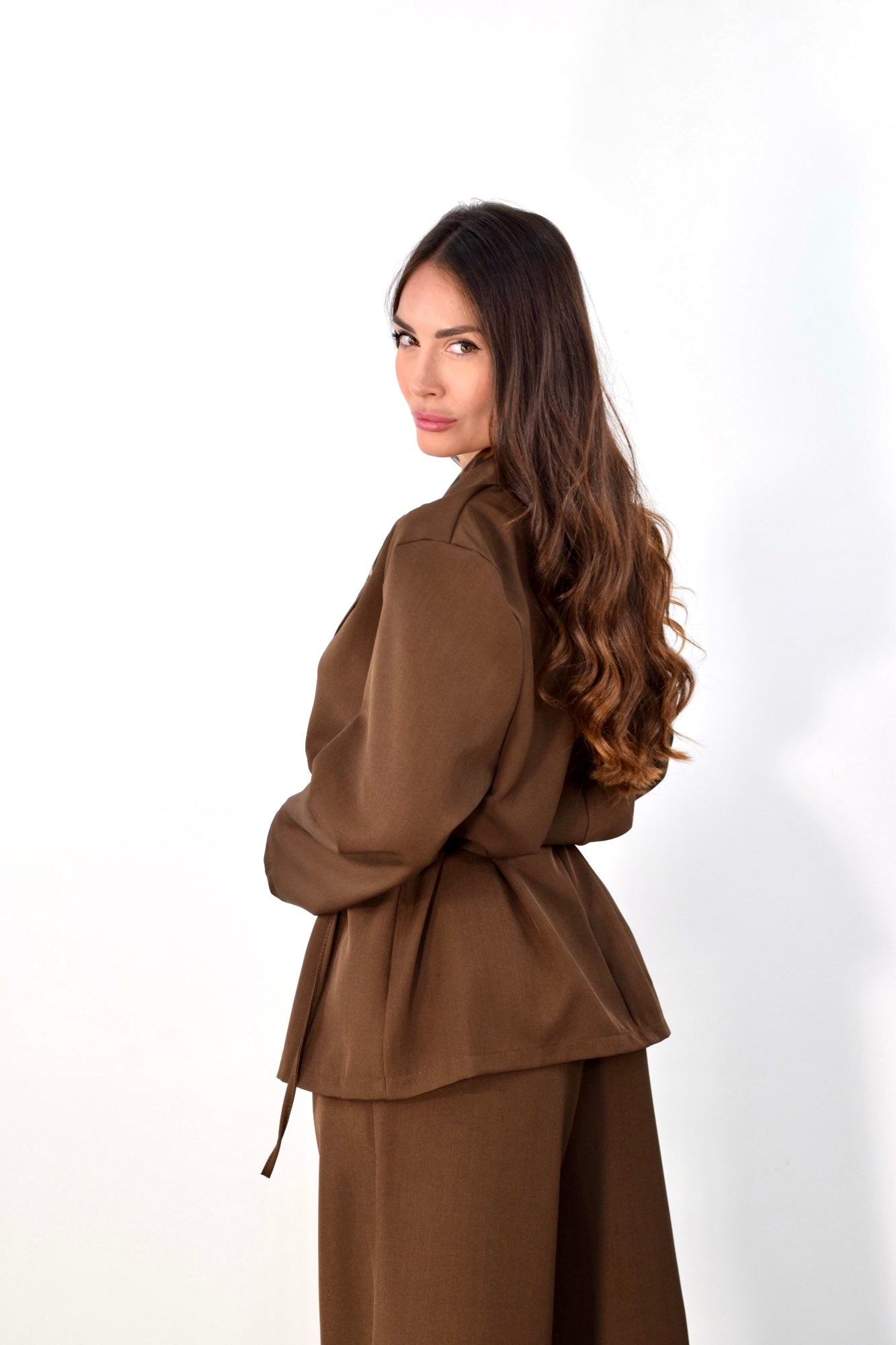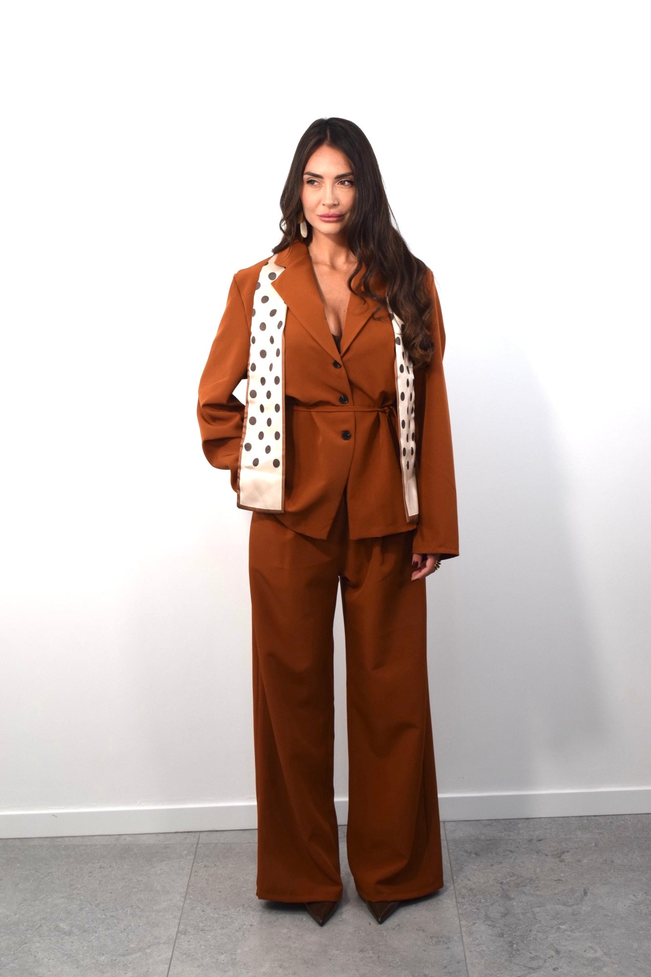 Tailleur due pezzi in taglia unica, composto da blusa con maniche leggermente a campana, tre bottoni frontali e cinturina in vita. Pantalone ampio con elastico sul retro per un comfort ideale e una vestibilità versatile.