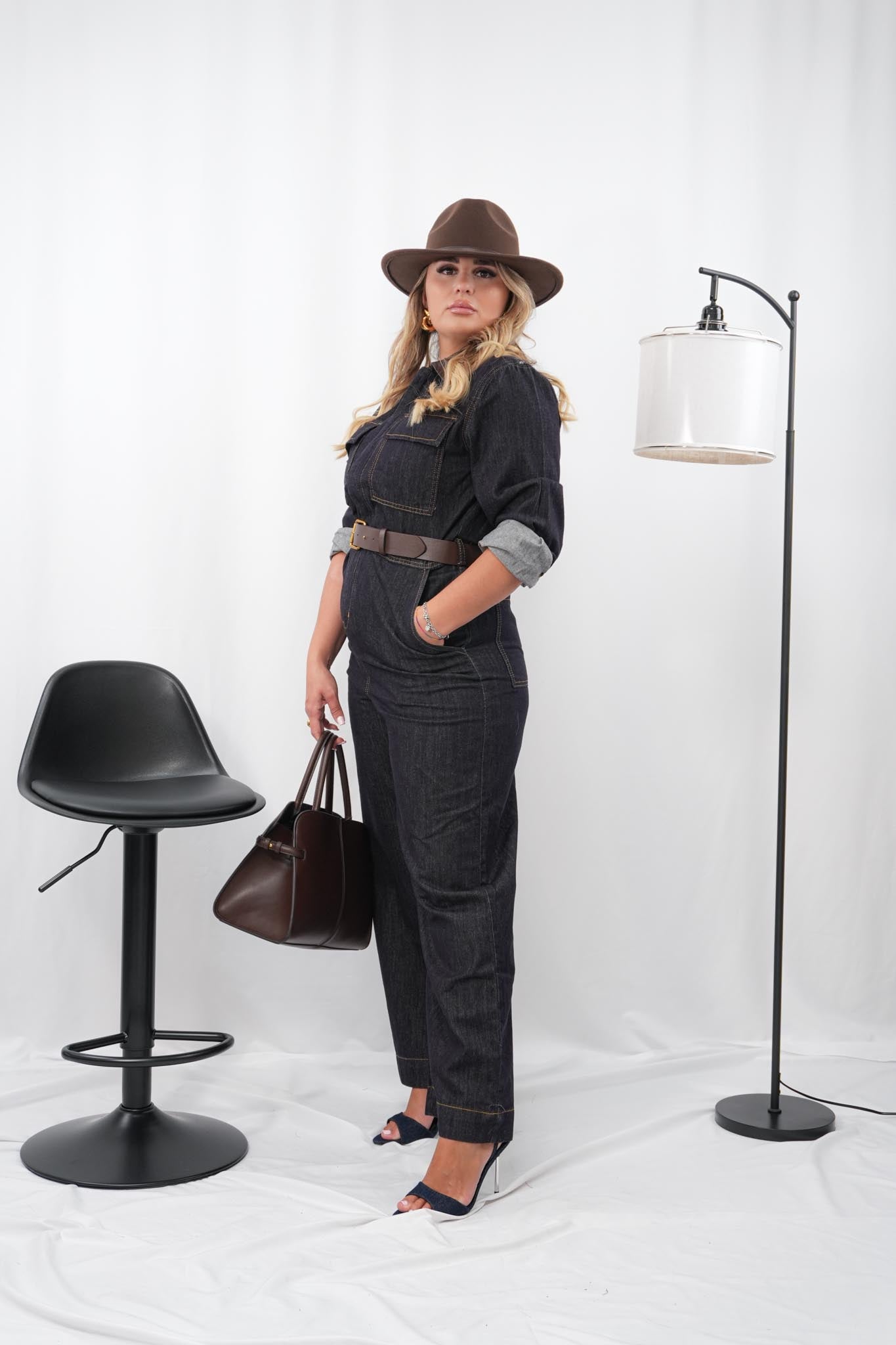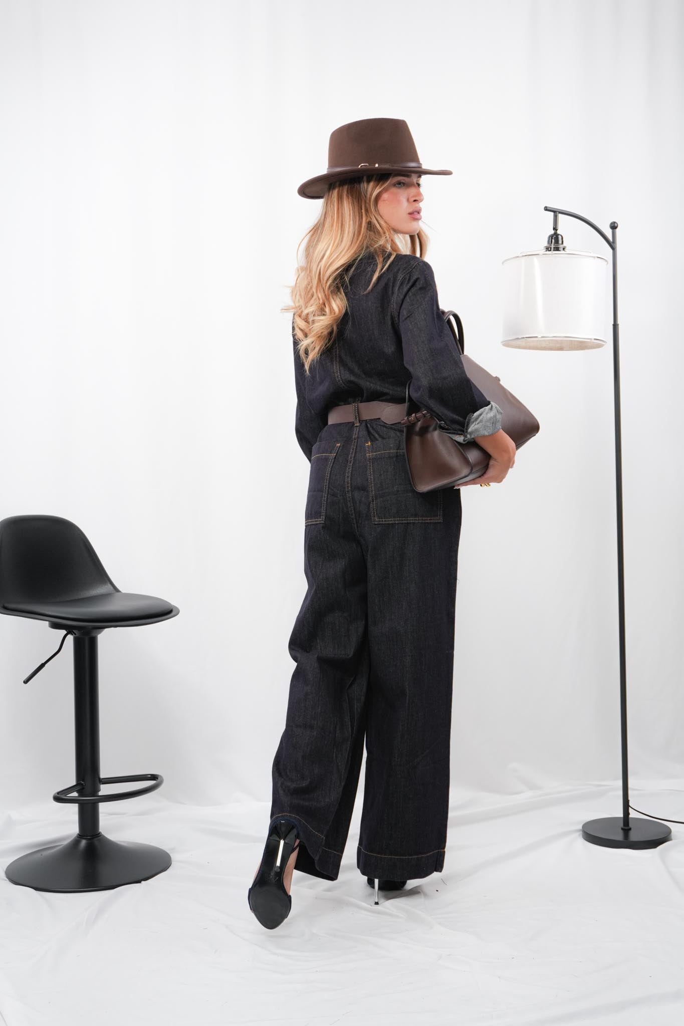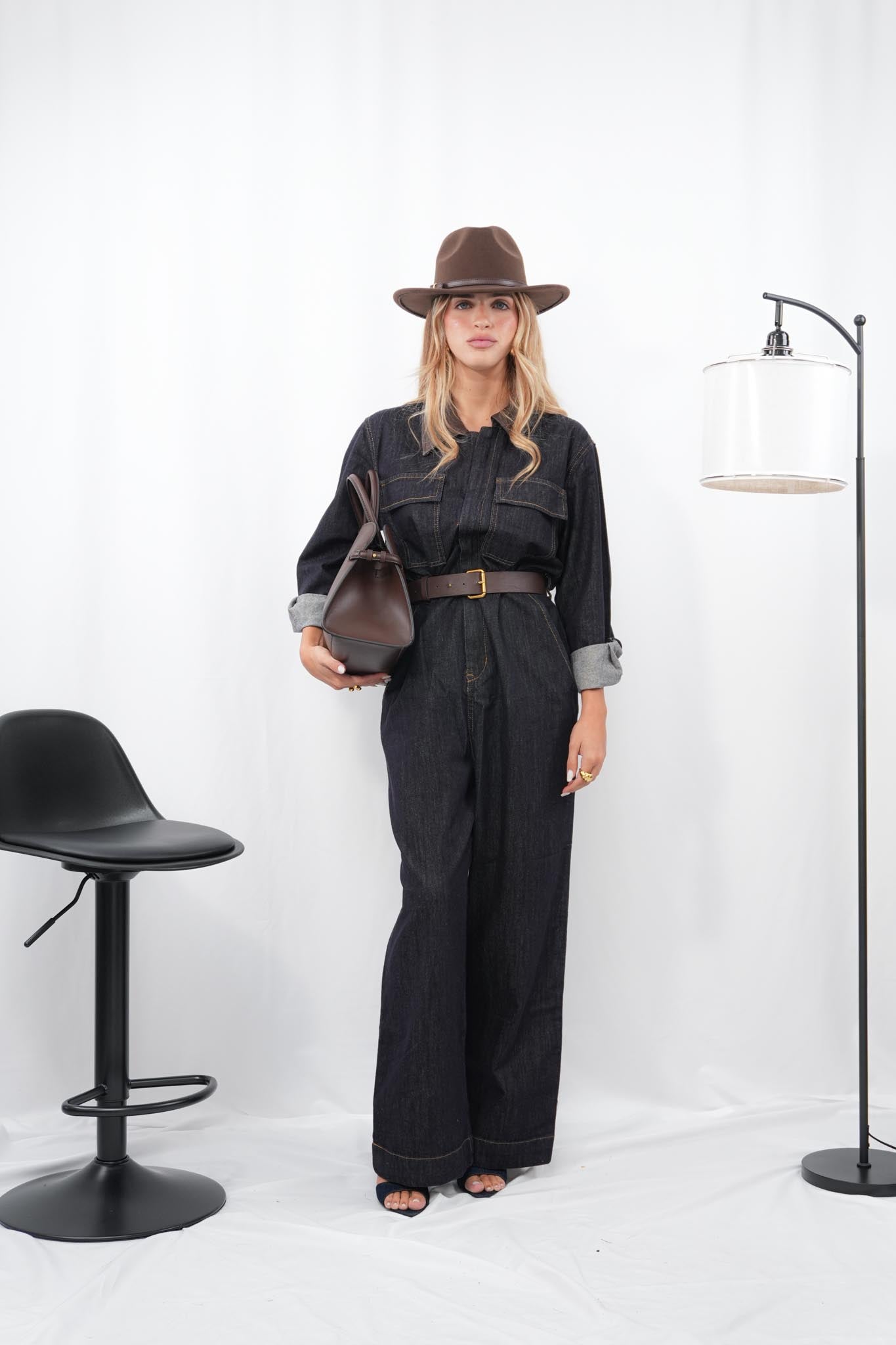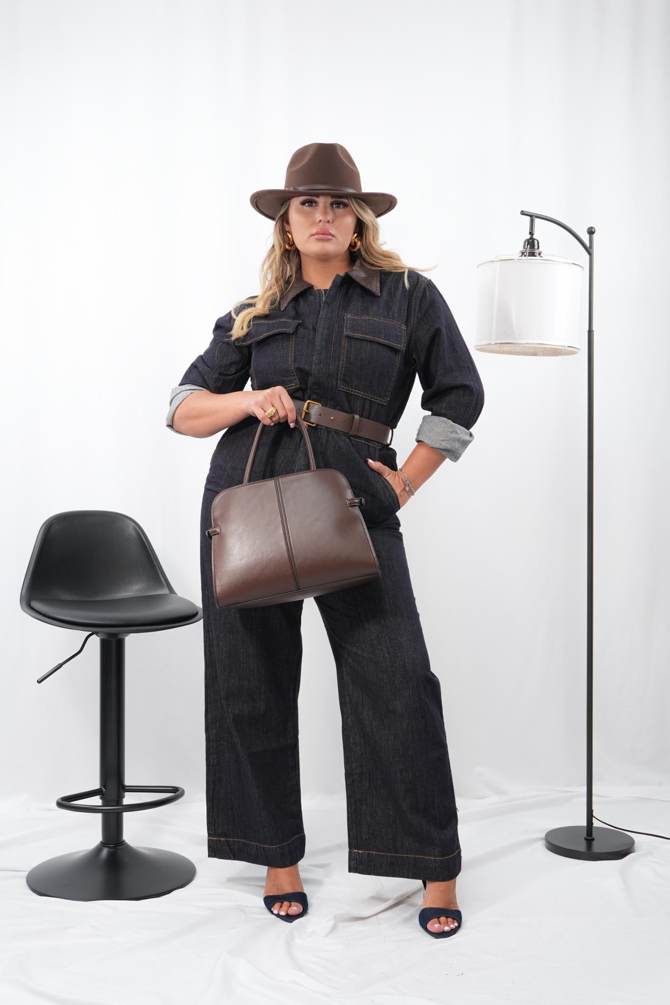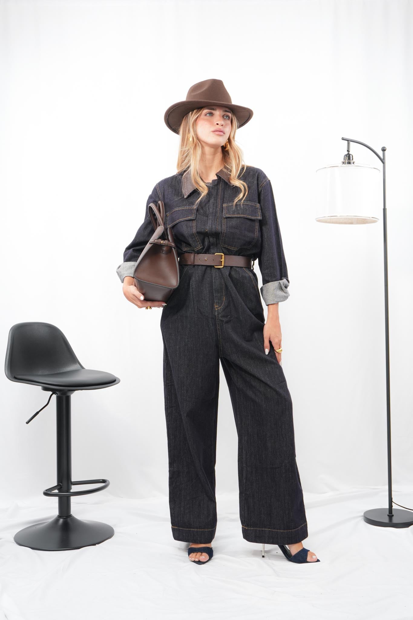 Jumpsuit in denim fermo con zip frontale, collo in ecopelle color cioccolato e cintura coordinata regolabile e removibile, dal design strutturato e grintoso, ideale per un look urban e originale con dettagli che fanno la differenza.