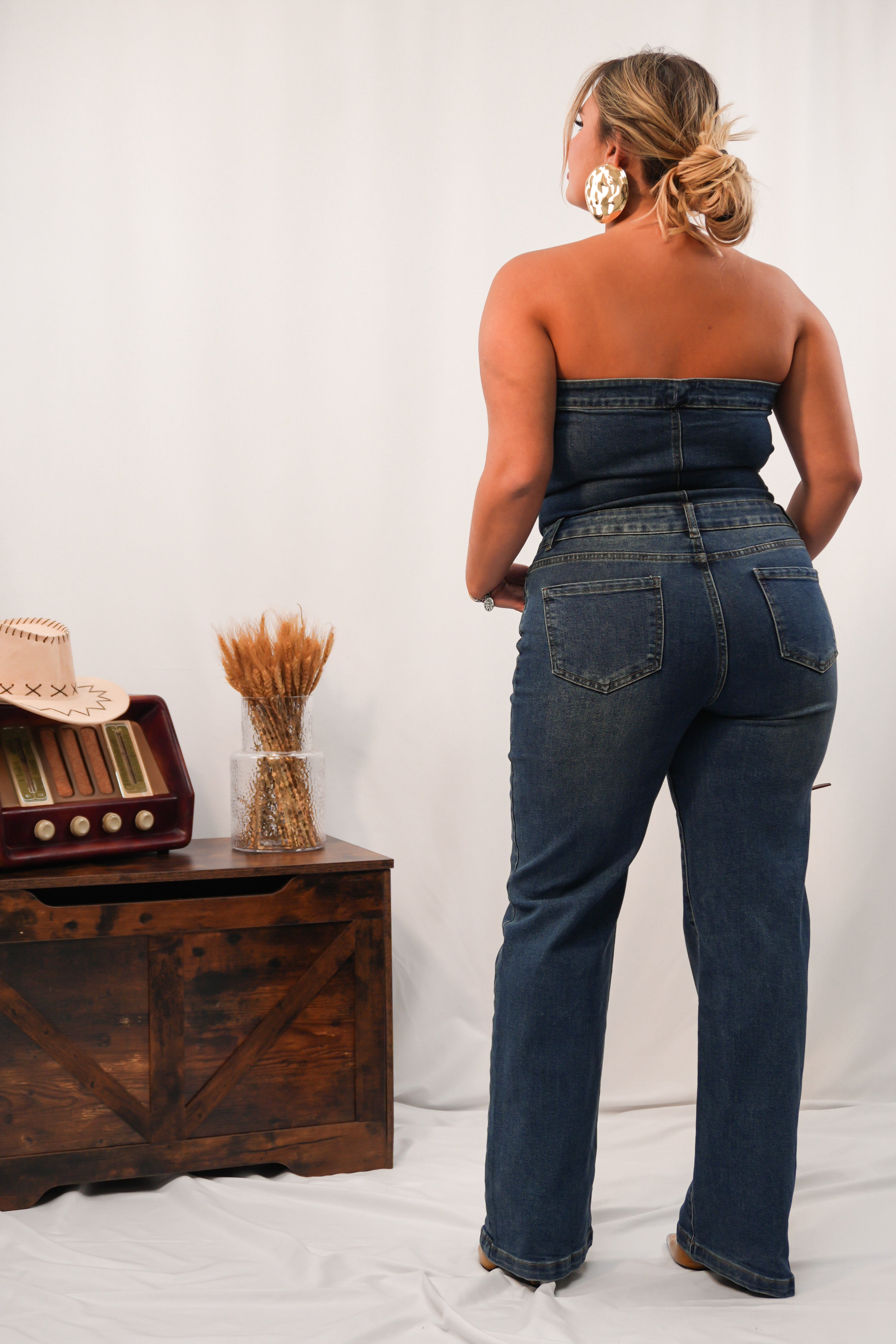 Jumpsuit in total denim con chiusura frontale a bottoni, linea dritta e tessuto elasticizzato che garantisce una vestibilità comoda e aderente. Modello versatile, adatto sia a fisicità slim che curvy.