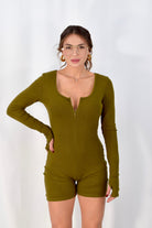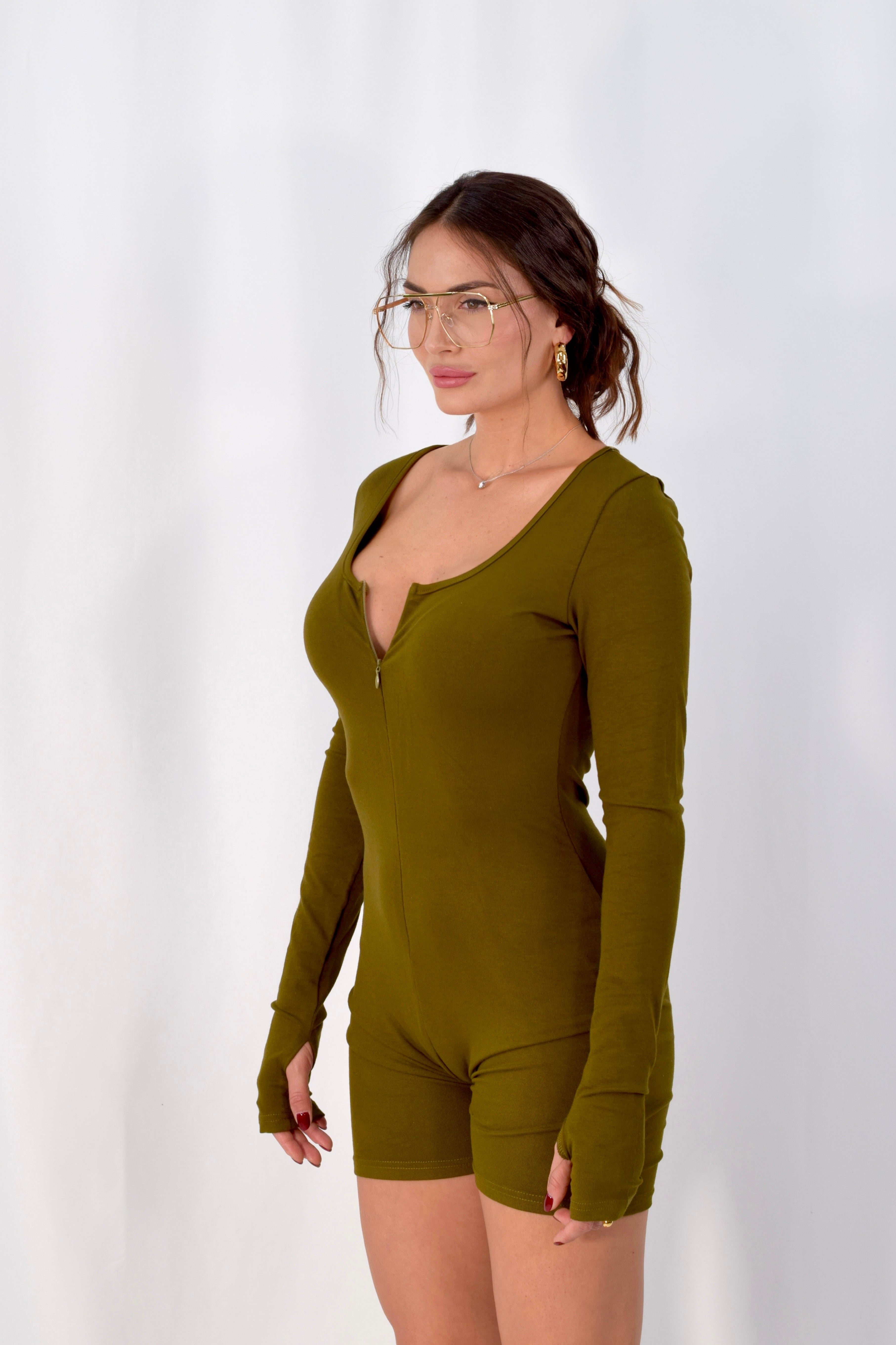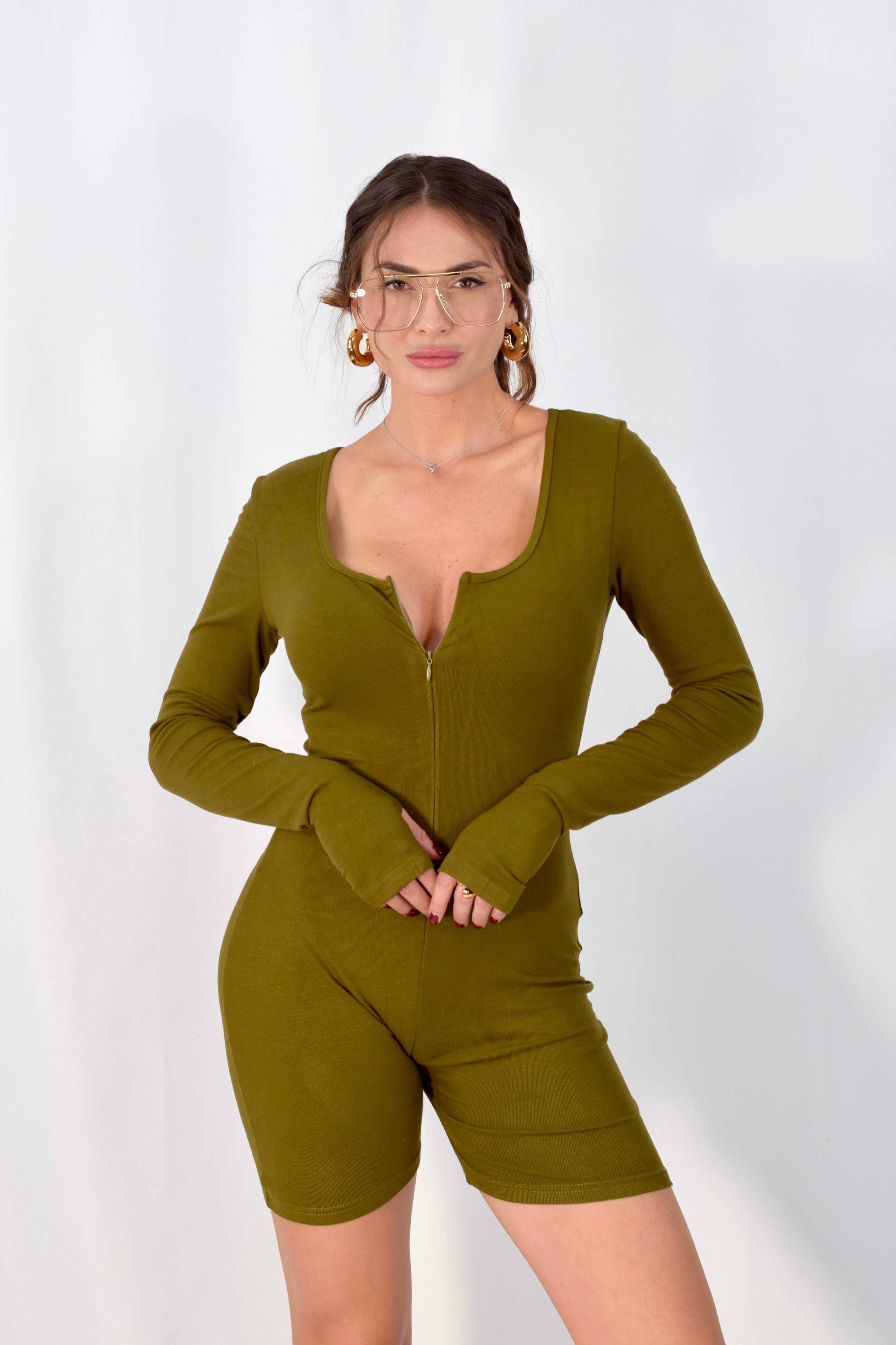 Jumpsuit elasticizzata a manica lunga con dettaglio a guanto e zip frontale. Aderente e comoda, valorizza la figura con una linea pulita e contemporanea. Taglia unica, veste in modo versatile.