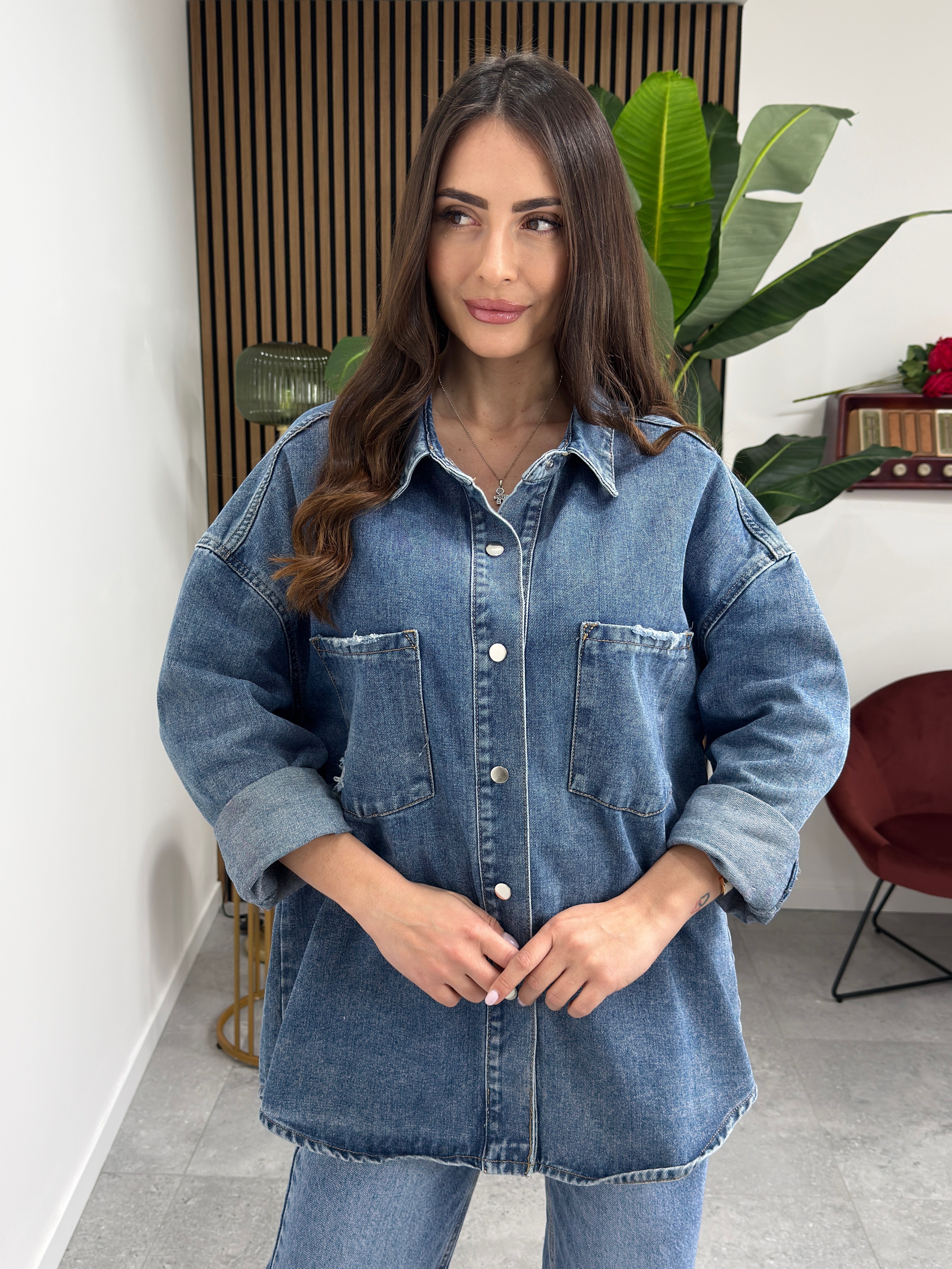 Giacca oversize in denim caratterizzata da una vestibilità ampia e comoda, arricchita da clip frontali argentate che aggiungono un tocco moderno e distintivo al design. Perfetta per uno stile casual e contemporaneo.