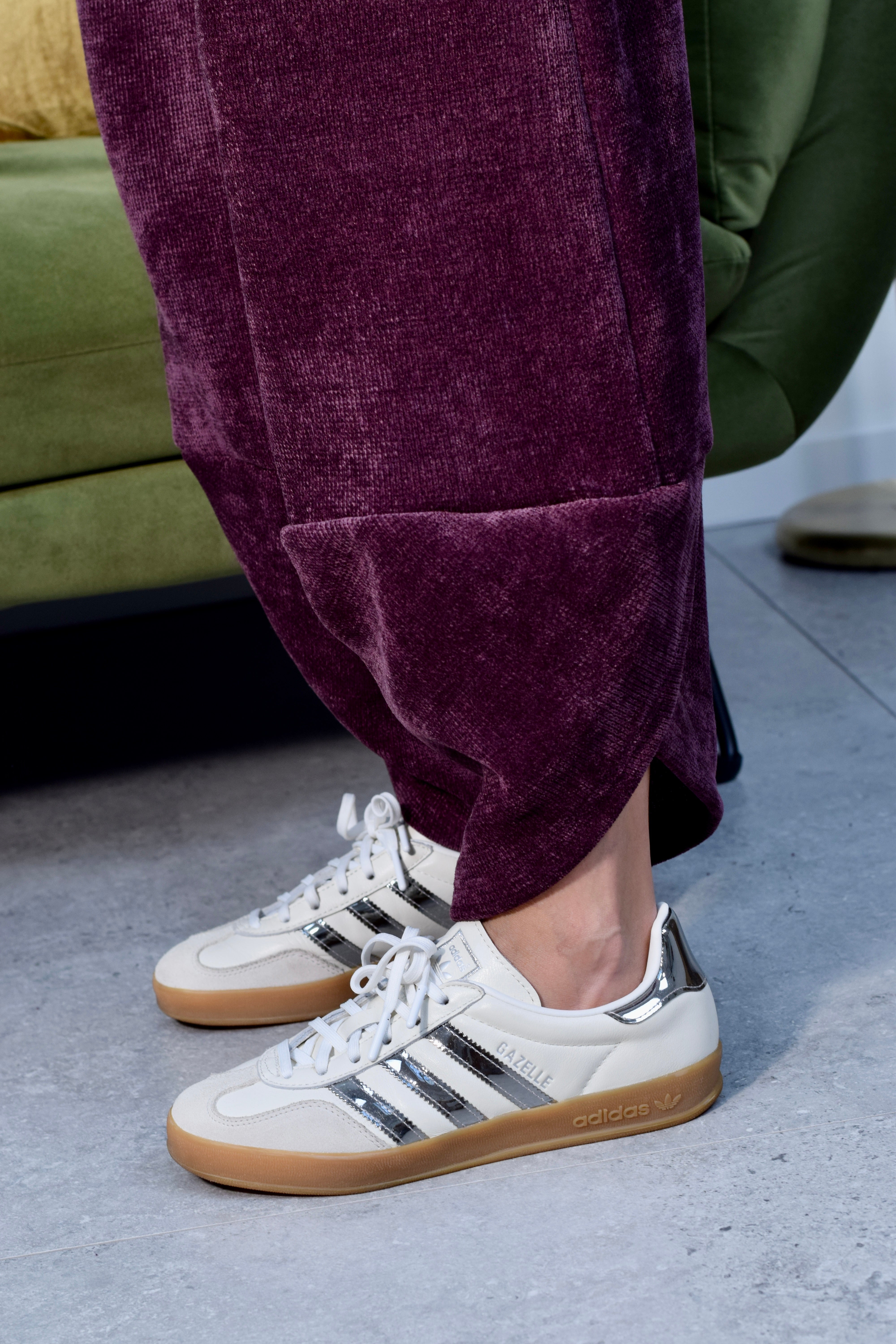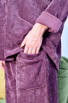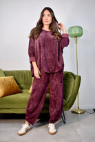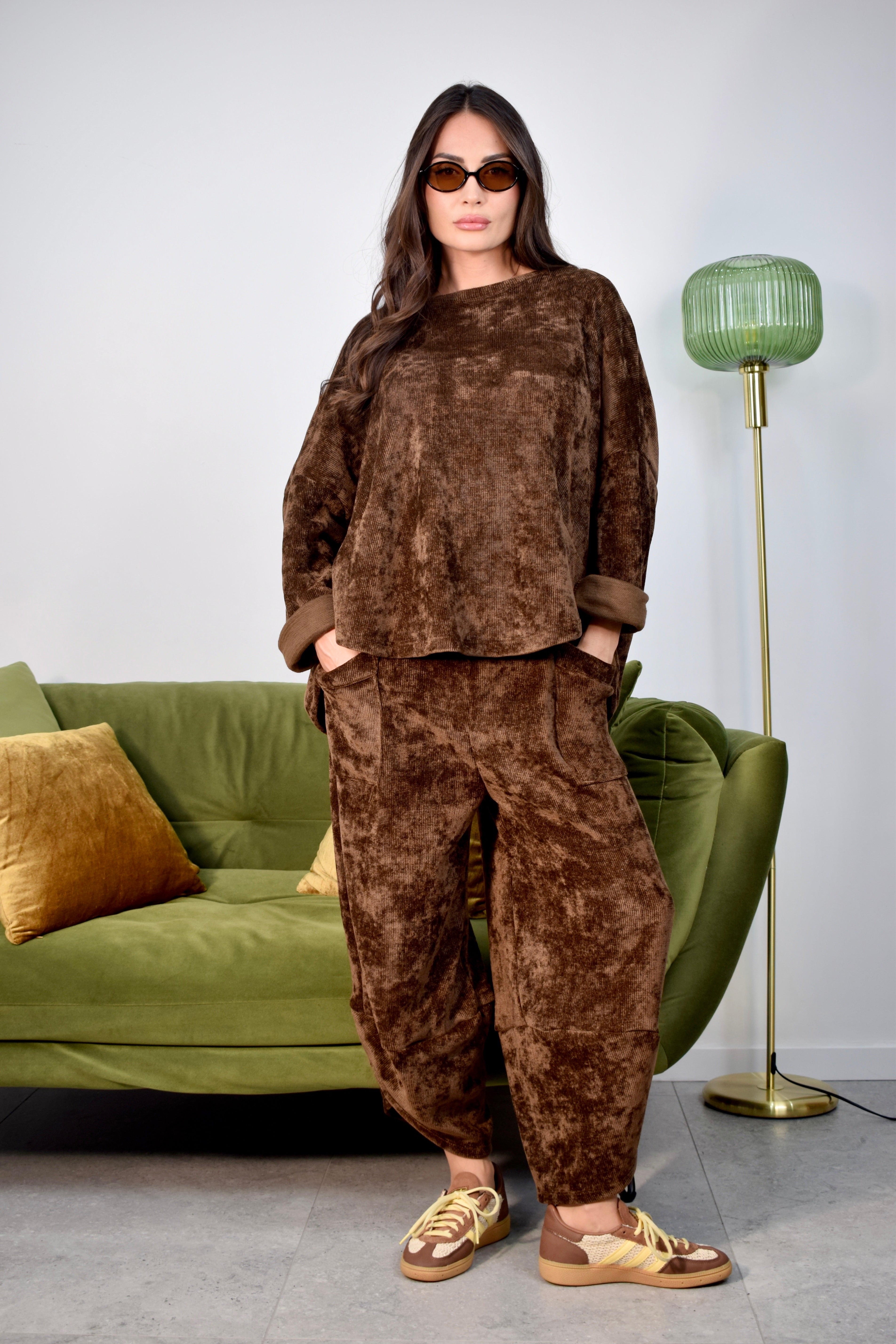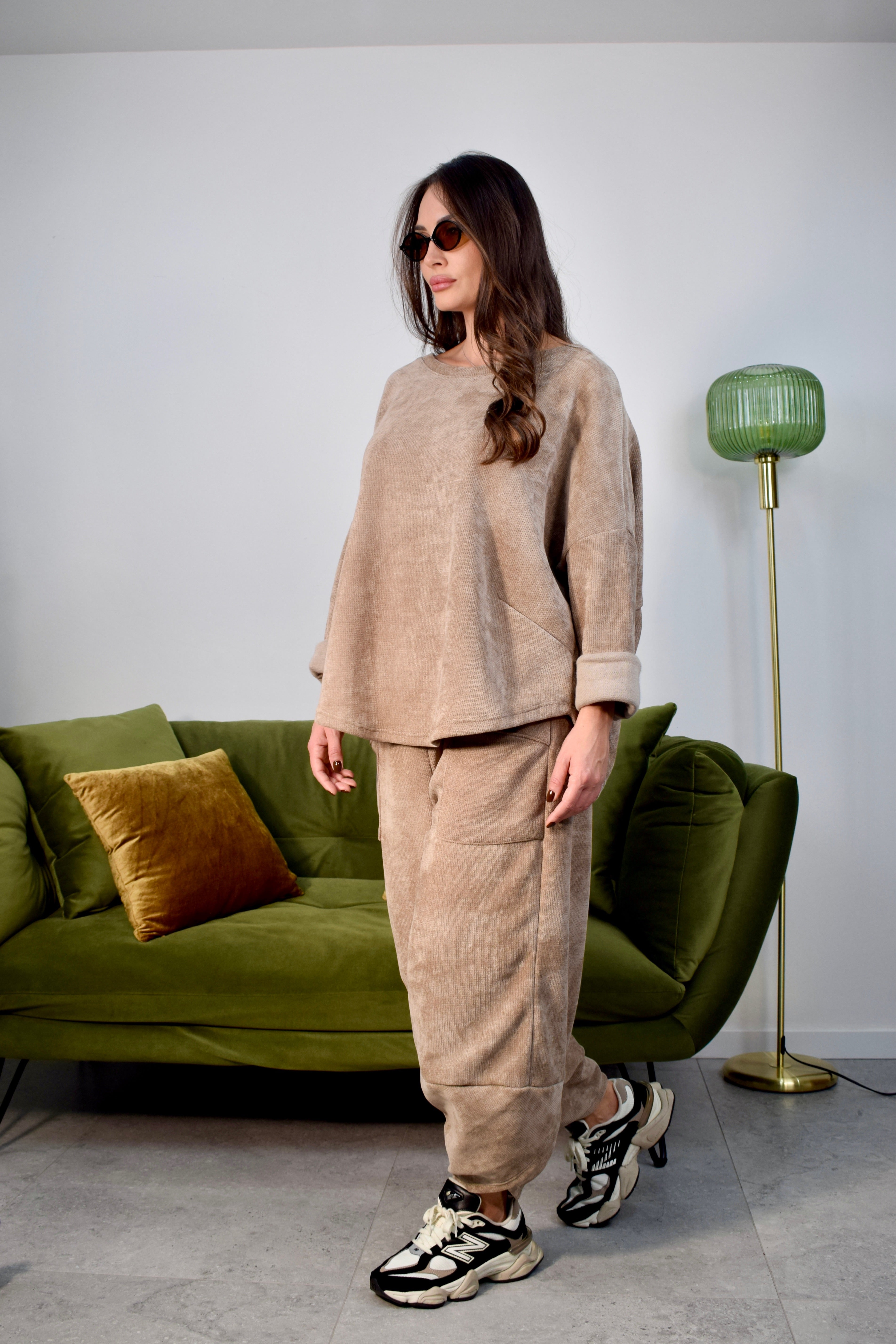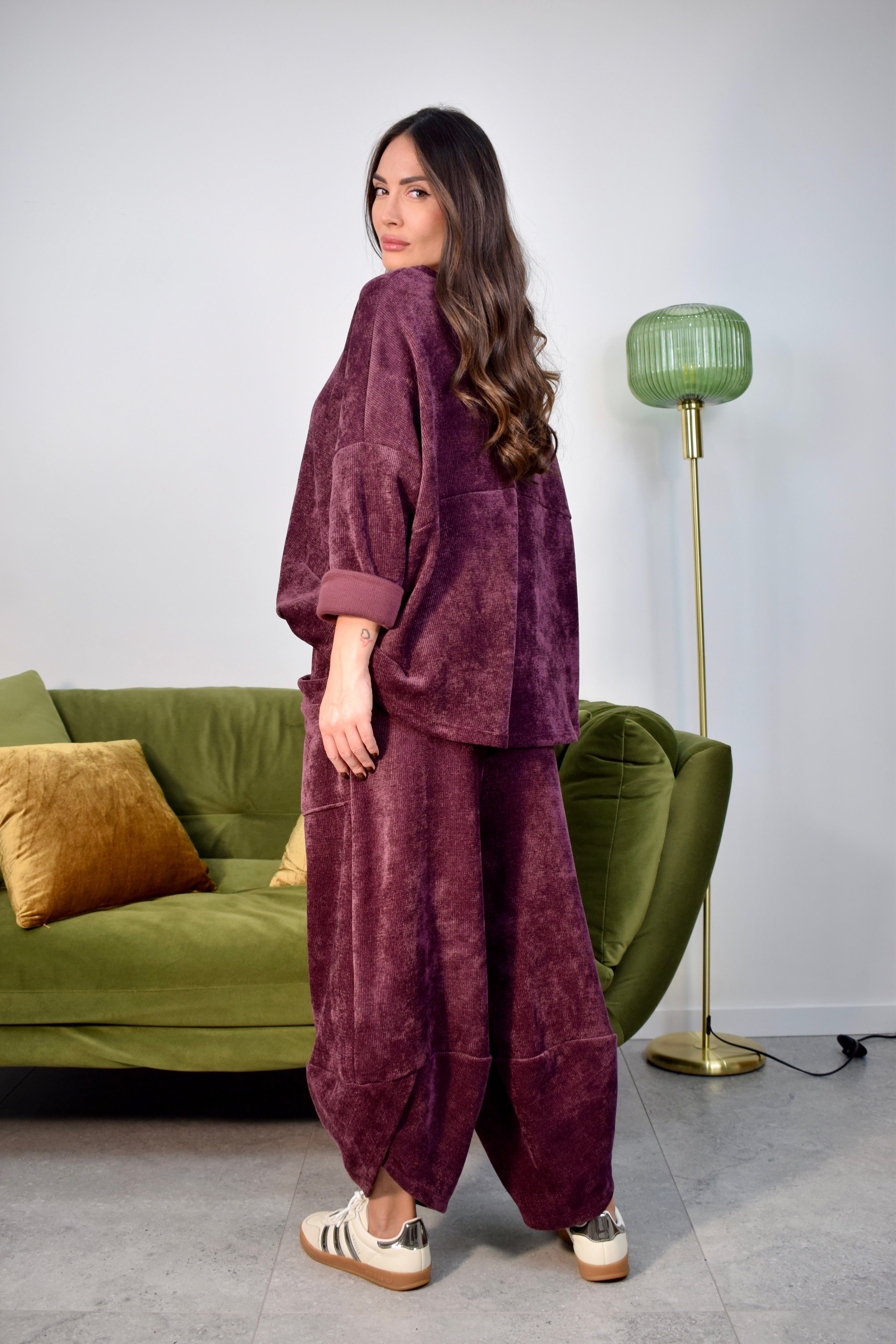 Coordinato due pezzi taglia unica in morbida ciniglia a costine, composto da felpa ampia con maniche risvoltate tono su tono e pantalone balloon con spacchetti laterali sul fondo, tasconi frontali ed elastico in vita. Un completo comodo e contemporaneo, perfetto per un look casual ma curato.