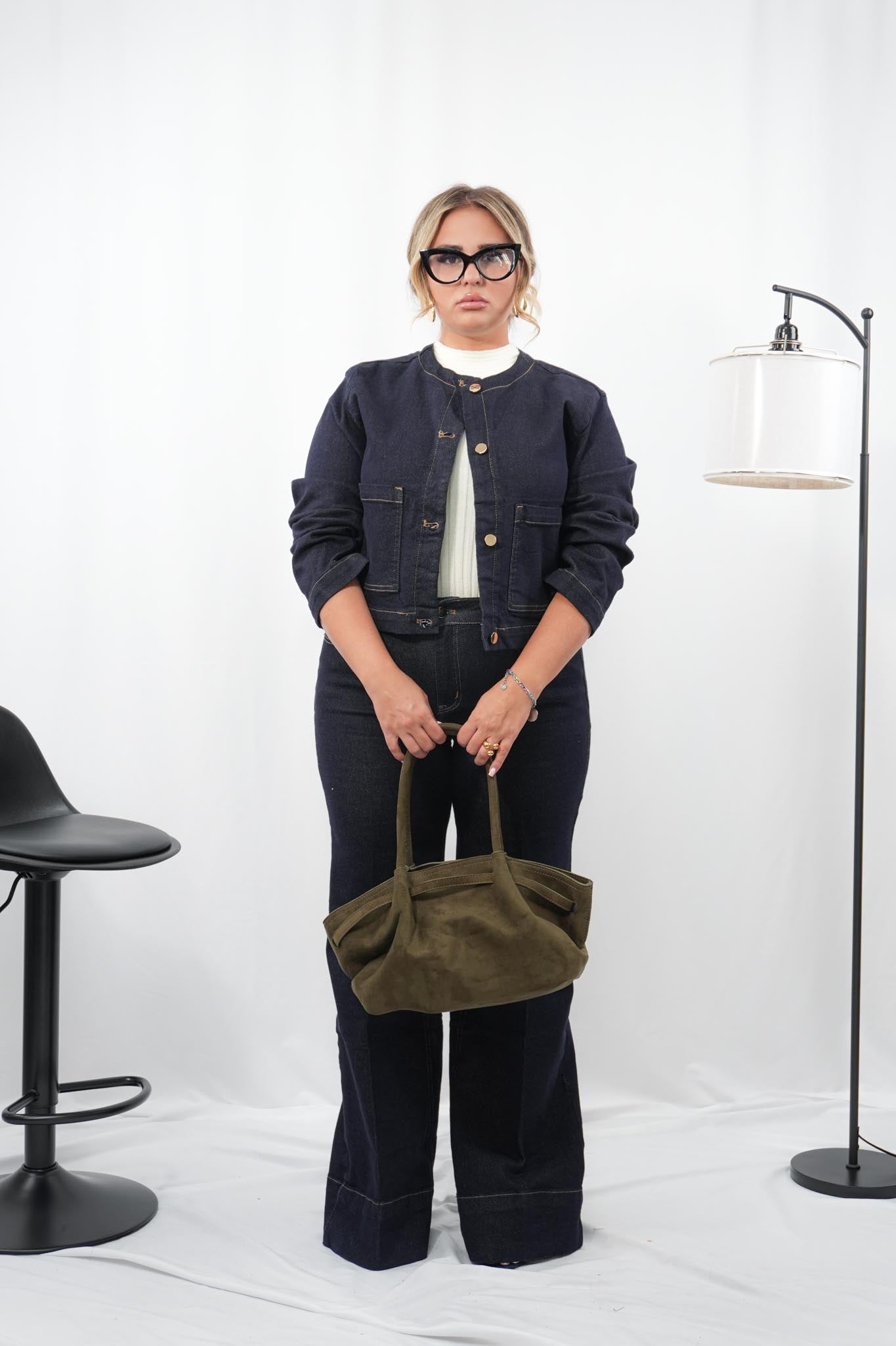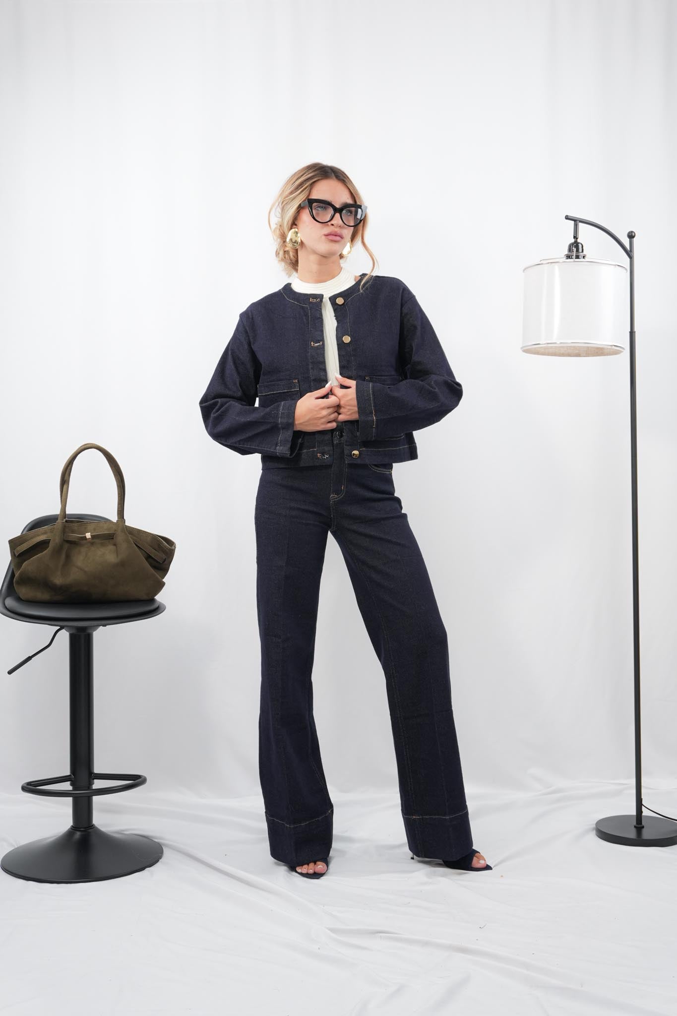 Coordinato in denim super elasticizzato composto da giacca con bottoni frontali e pantalone a palazzo, taglio moderno e confortevole, ideale per un look pratico ma di tendenza; super comodo e adatto a diverse fisicità, le modelle in foto sono alte 1,65 m.